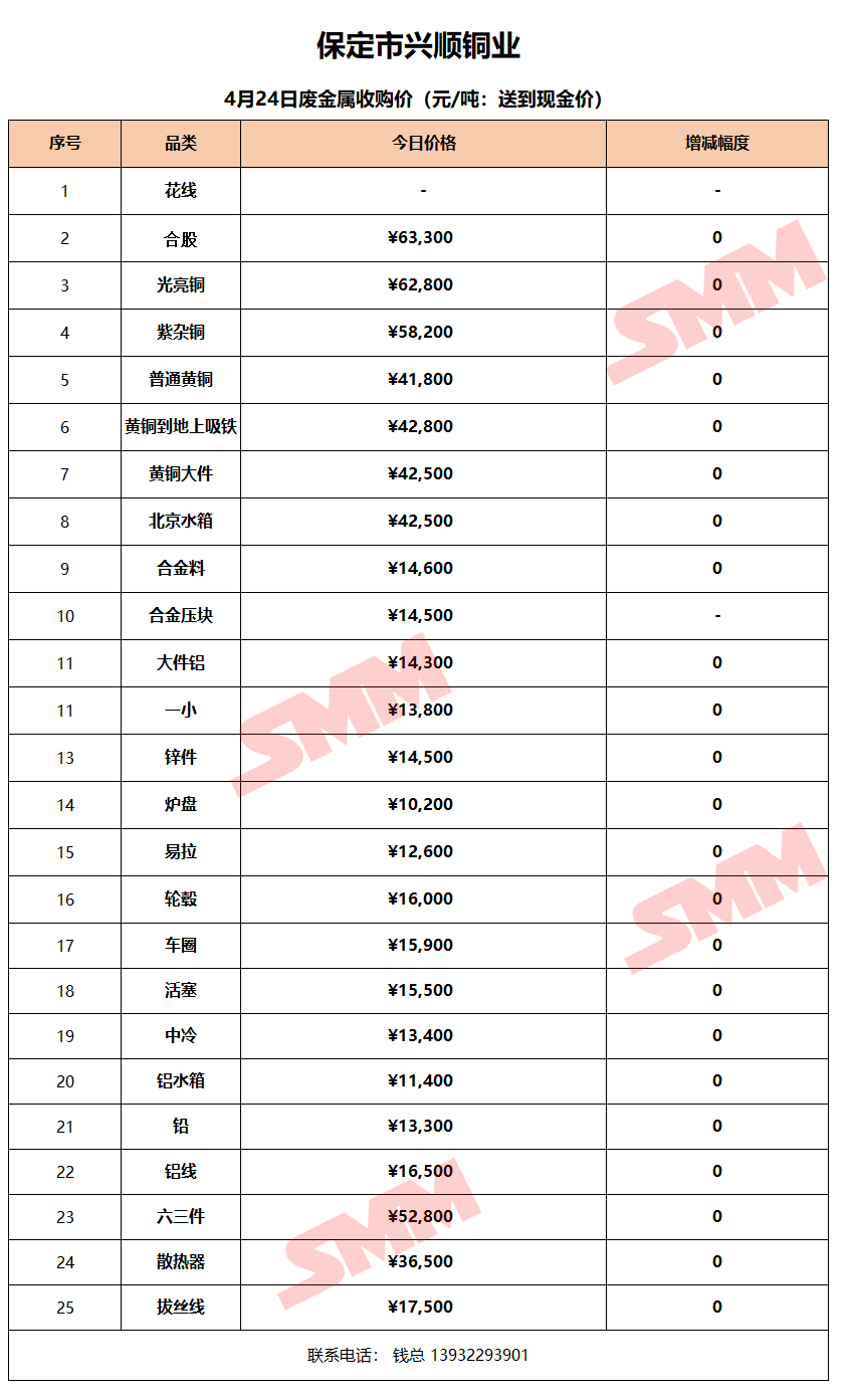 今日保定兴顺铜业,废金属收购报价已更新,有货的朋友欢迎联系我们!