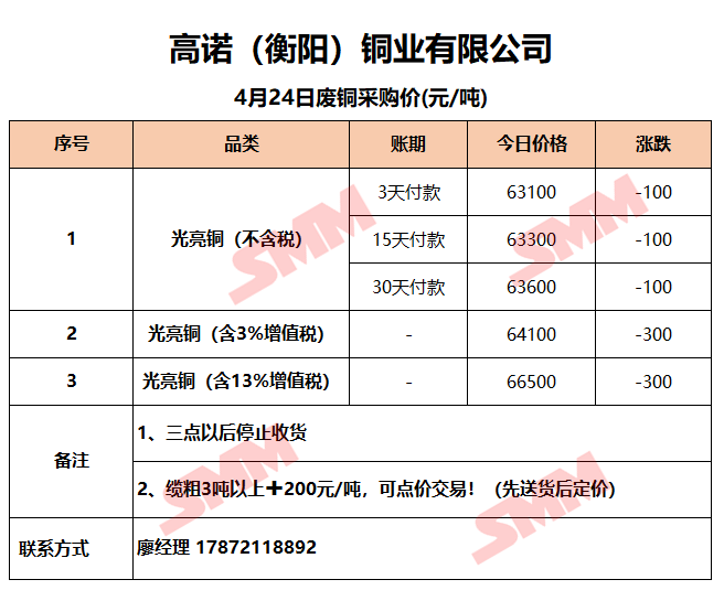 4月24日高诺(衡阳)铜业 废铜采购第二次报价