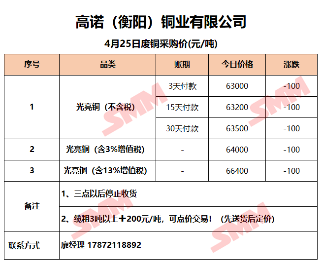 4月25日高诺(衡阳)铜业 废铜采购报价