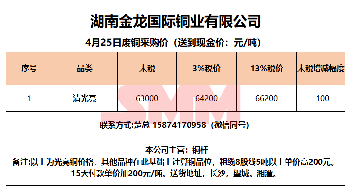 4月25日湖南金龙 废铜采购报价