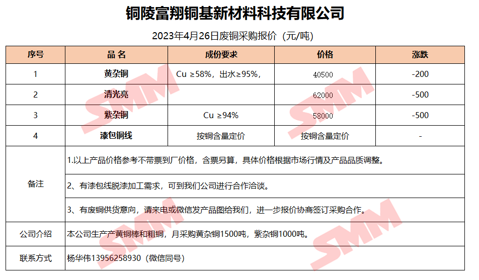 4月26日铜陵富翔 废铜采购报价