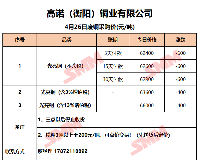 4月26日高诺(衡阳)铜业 废铜采购报价