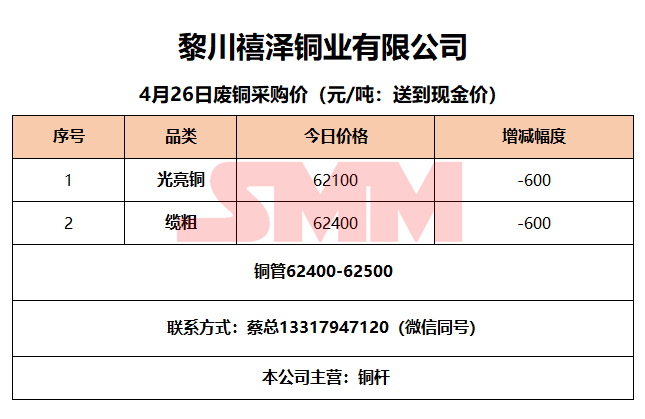 4月26日黎川禧泽铜业 废铜采购报价