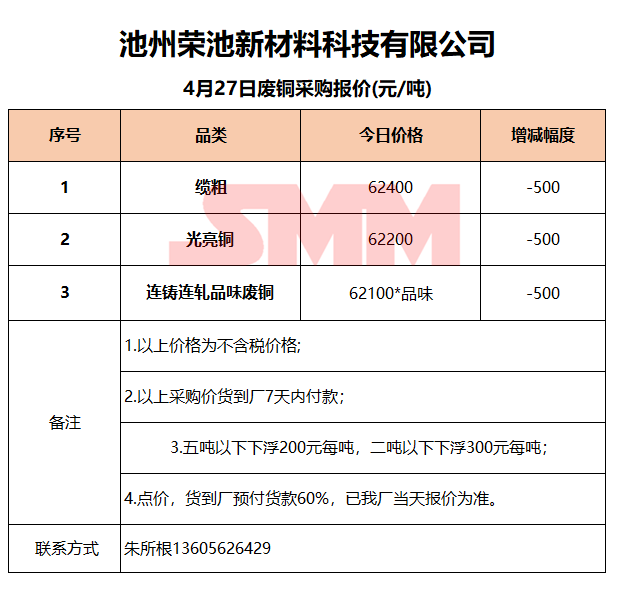 4月27日池州荣池 废铜采购报价