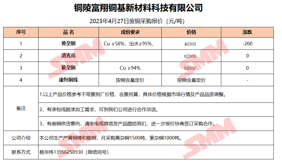 4月27日铜陵富翔 废铜采购报价
