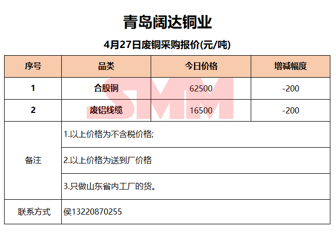 4月27日青岛阔达 废铜采购报价