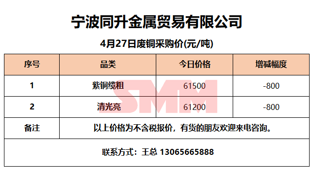 今日宁波同升金属,废铜采购报价已更新,有货的朋友欢迎联系我们!