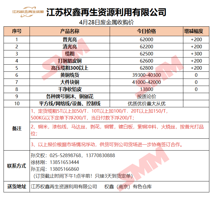 4月28日江苏权鑫 废金属收购报价