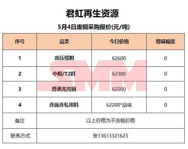 5月4日君虹再生资源 废铜收购报价