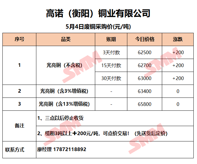5月4日高诺(衡阳)铜业 废铜采购报价