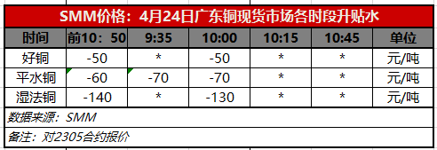 4月24日广东铜现货市场各时段升贴水(第二时段10:00)【SMM价格】