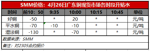 4月26日广东铜现货市场各时段升贴水(第二时段10:00)【SMM价格】