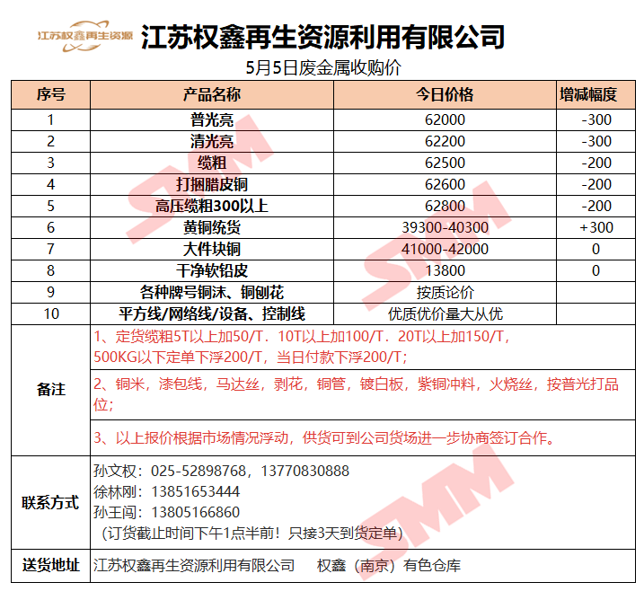 今日江苏权鑫再生资源利用有限公司 废金属收购报价已更新,有货的朋友欢迎联系我们!