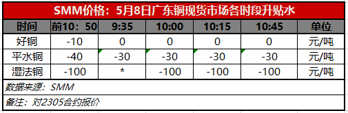 5月8日广东铜现货市场各时段升贴水(第四时段10:45)【SMM价格】