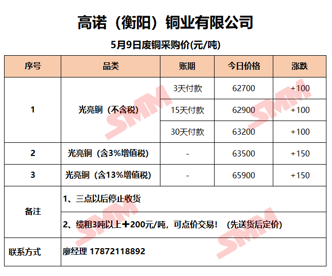5月9日高诺(衡阳)铜业 废铜采购报价