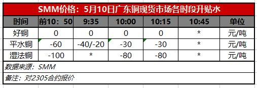 5月10日广东铜现货市场各时段升贴水(第三时段10:15)【SMM价格】