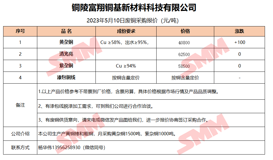 5月10日铜陵富翔 废铜采购报价