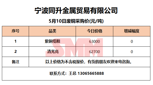 5月10日同升金属 废铜采购报价