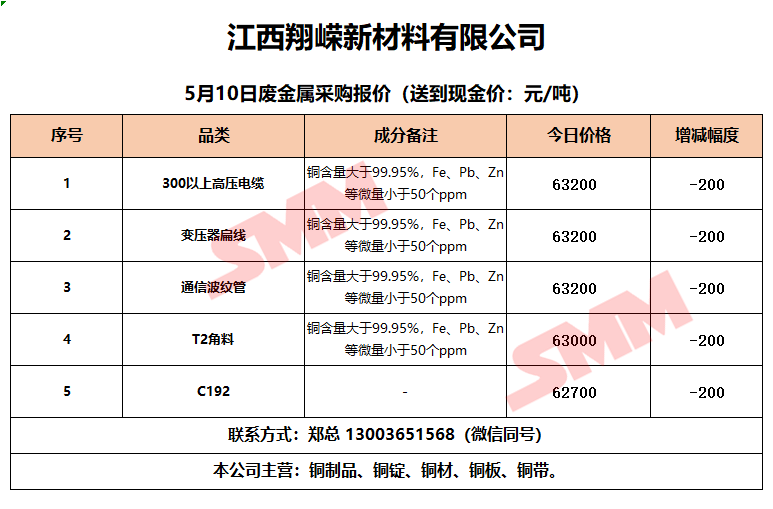 5月10日江西翔嵘新材料 废铜采购报价