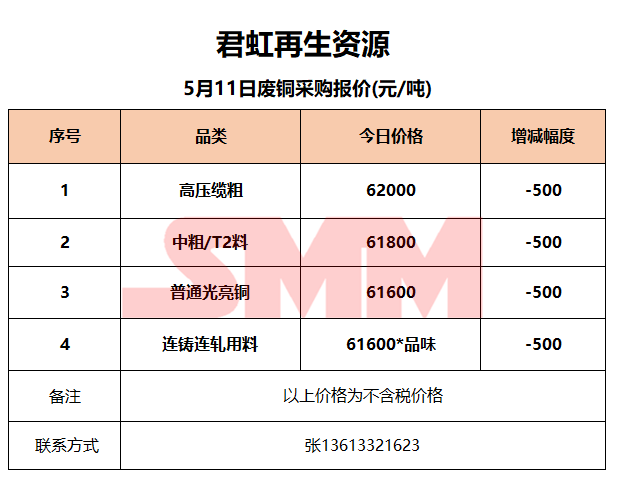 5月11日君虹再生资源 废铜收购报价