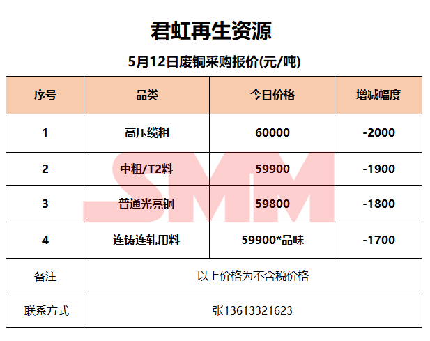 5月12日君虹再生资源 废铜收购报价