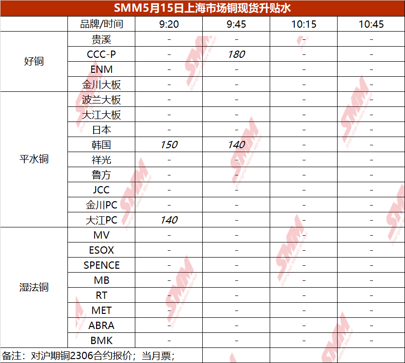 5月15日上海市场铜现货升贴水(第二时段)【SMM价格】