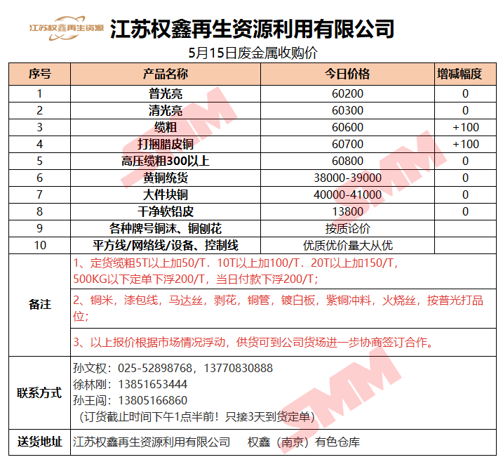 今日江苏权鑫再生资源利用有限公司 废金属收购报价已更新,有货的朋友欢迎联系我们!