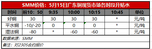 5月15日广东铜现货市场各时段升贴水(第三时段10:15)【SMM价格】