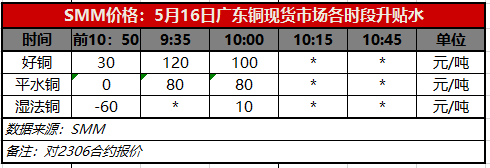5月16日广东铜现货市场各时段升贴水(第二时段10:00)【SMM价格】