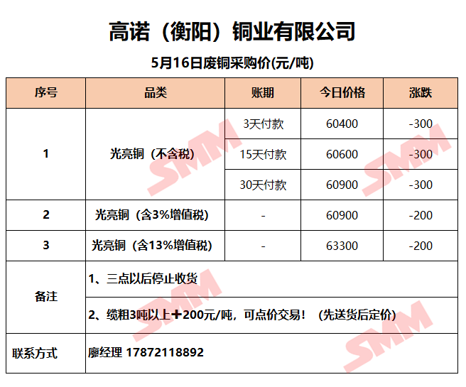 5月16日高诺(衡阳)铜业 废铜采购报价