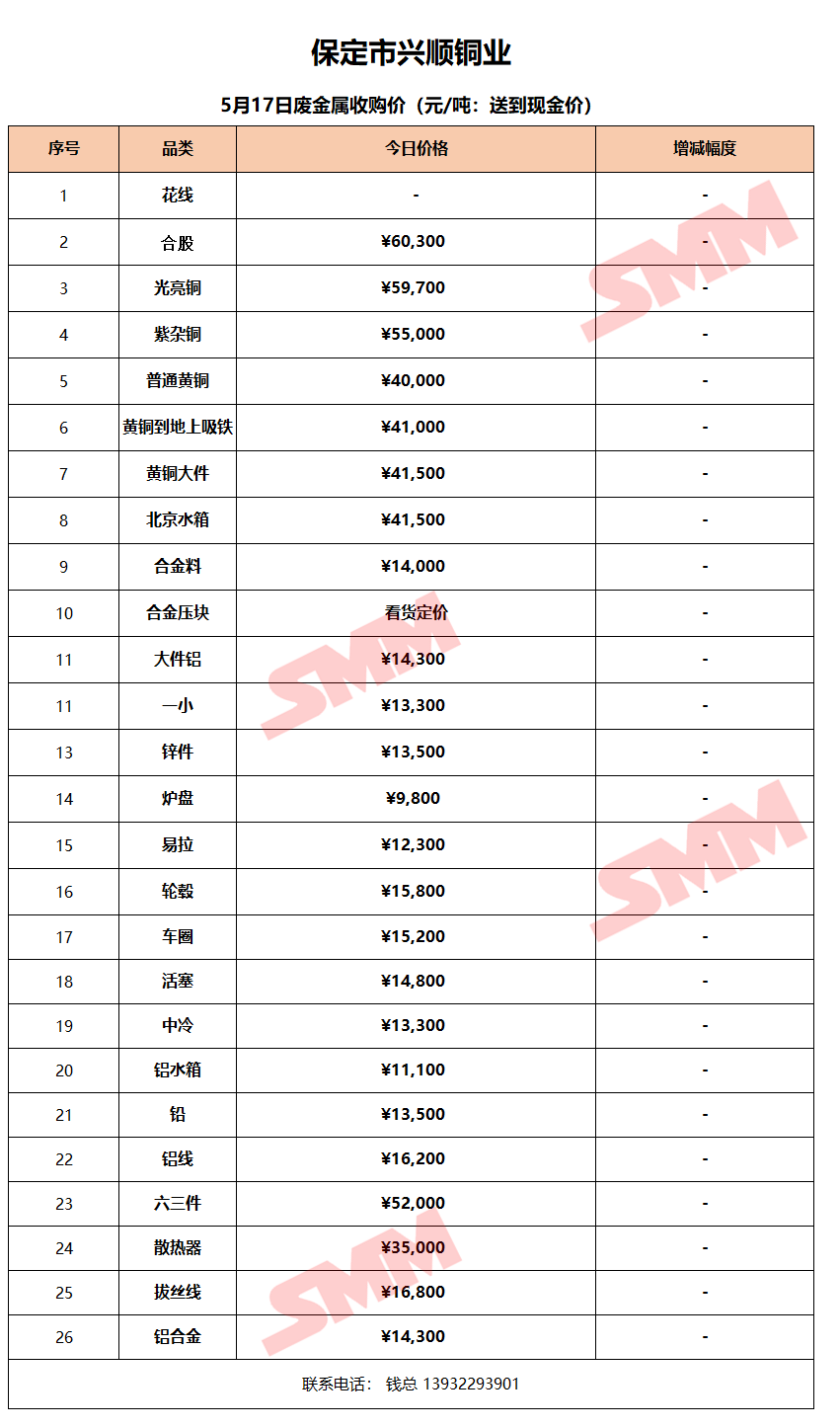 5月17日保定兴顺铜业 废金属收购报价