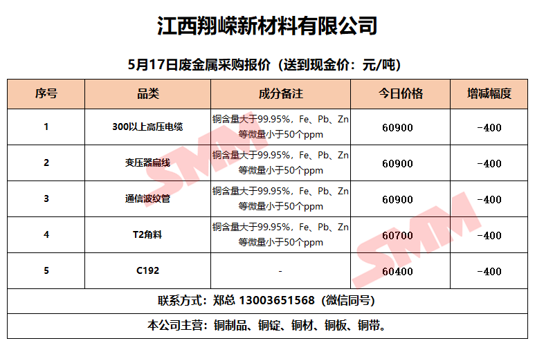 5月17日江西翔嵘新材料 废铜采购报价