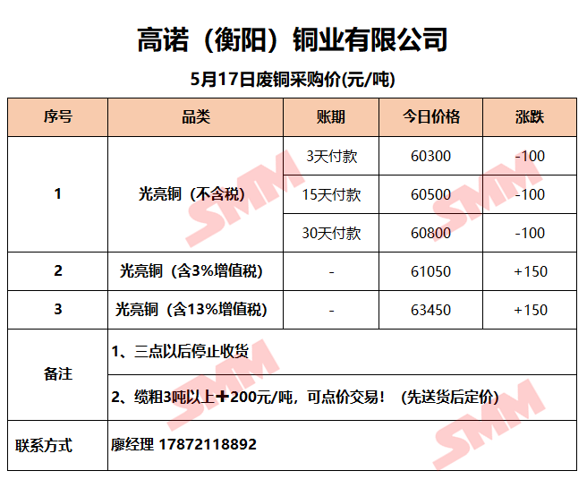 5月17日高诺(衡阳)铜业 废铜采购报价