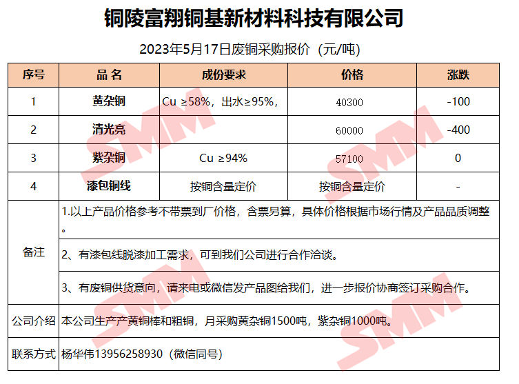 5月17日铜陵富翔 废铜采购报价