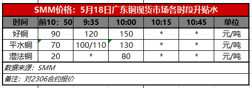 5月18日广东铜现货市场各时段升贴水(第二时段10:00)【SMM价格】