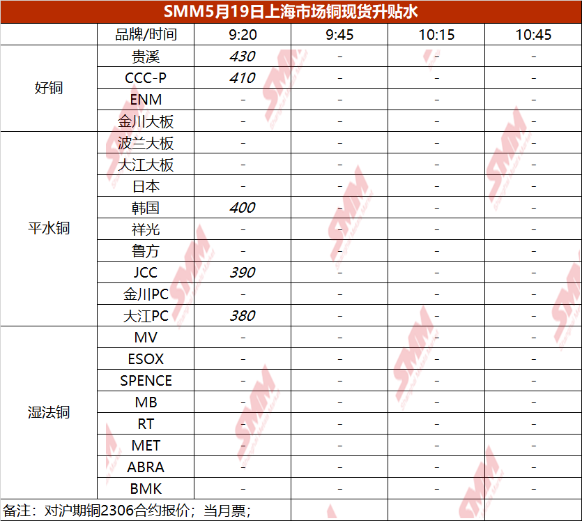 5月19日上海市场铜现货升贴水(第一时段)【SMM价格】