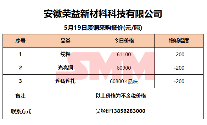 5月19日安徽荣益 废铜采购报价