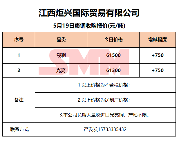 5月19日江西炬兴 废铜收购报价