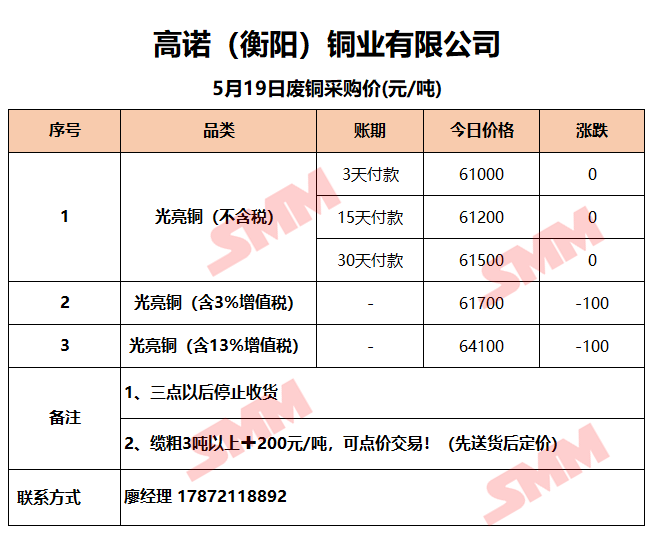 5月19日高诺(衡阳)铜业 废铜采购报价