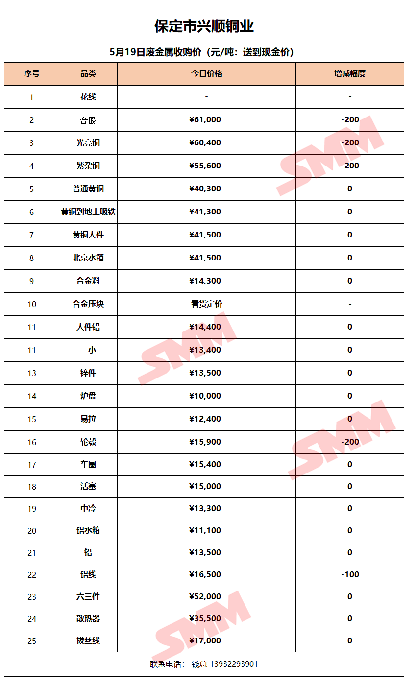 5月19日保定兴顺铜业 废金属收购报价
