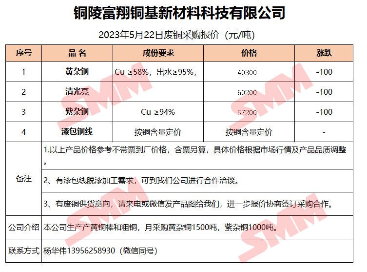 5月22日铜陵富翔 废铜采购报价