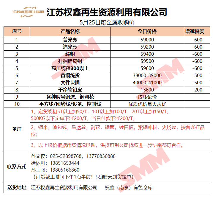 5月25日江苏权鑫 废金属收购报价