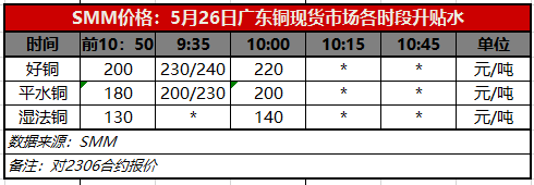 5月26日广东铜现货市场各时段升贴水(第二时段10:00)【SMM价格】