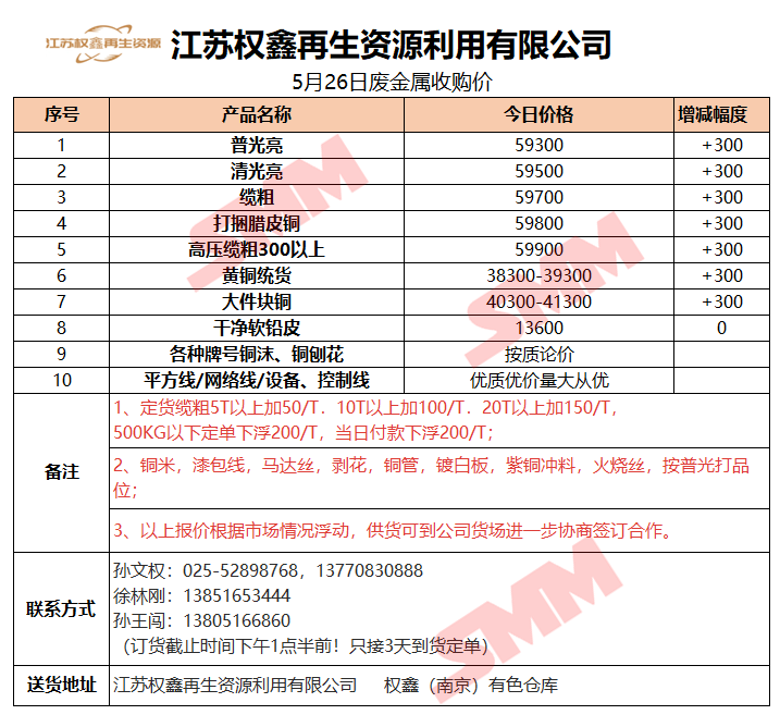 5月26日江苏权鑫 废金属收购报价