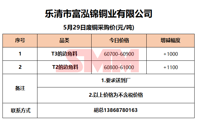 5月29日乐清富泓锦 废铜采购报价
