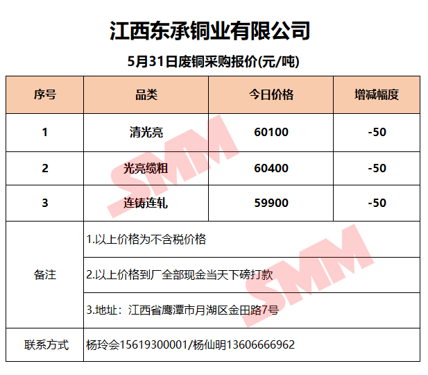 5月31日江西东承 废铜采购报价