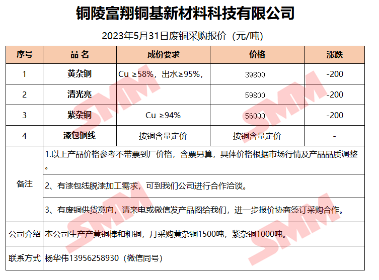 5月31日铜陵富翔 废铜采购报价