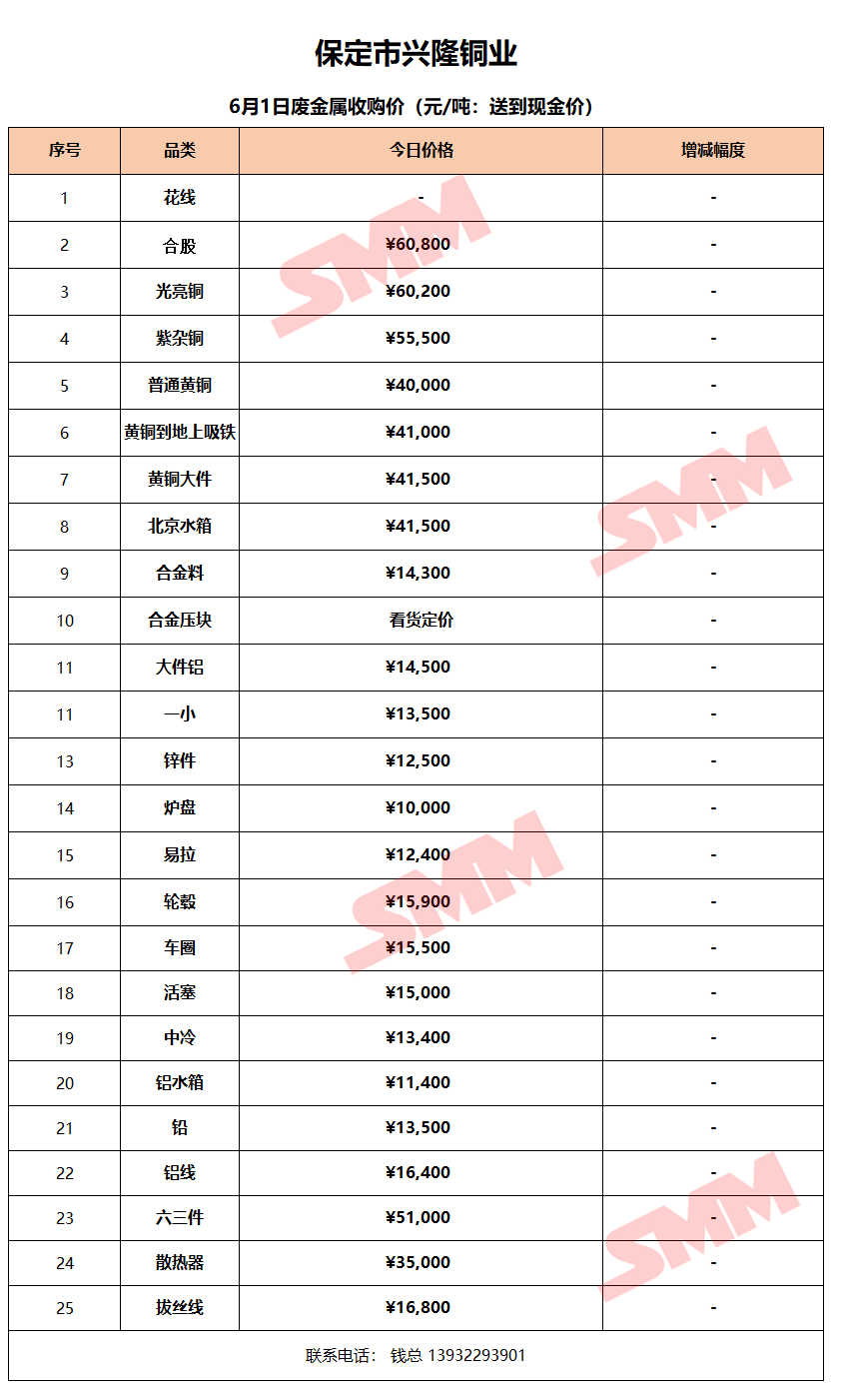 6月1日保定兴隆铜业 废金属收购报价