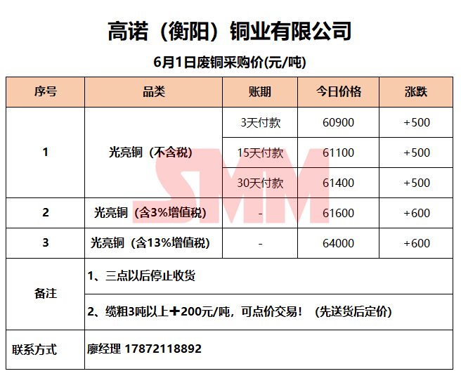 6月1日高诺(衡阳)铜业 废铜采购报价