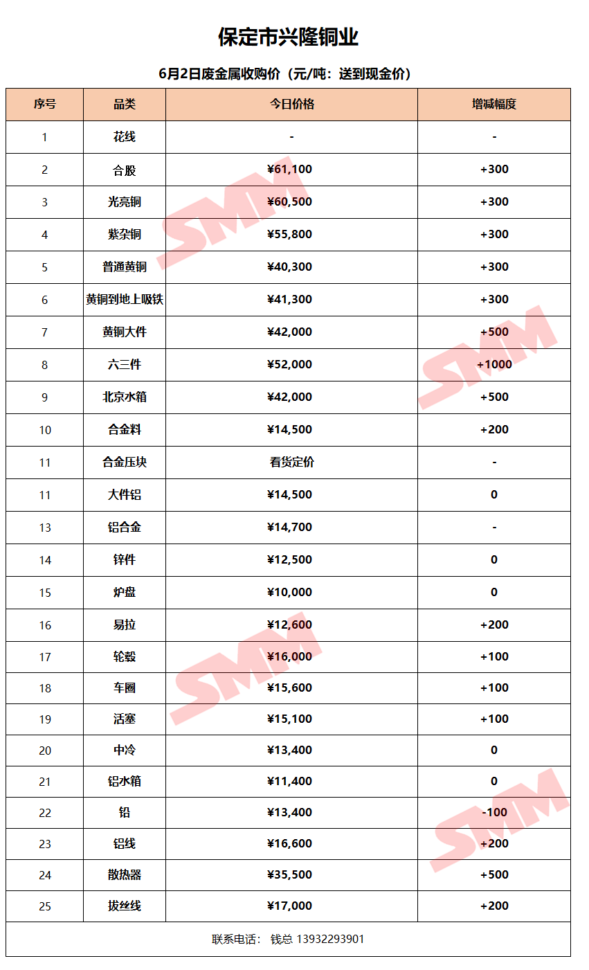 6月2日保定兴隆铜业 废金属收购报价